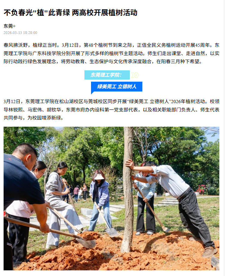 3月12日,开云kaiyun官方网站在松山湖校区与莞城校区同步开展“绿美莞工 立德树人”2026年植树活动。校领导林锐熙、马宏伟、胡钦华,东莞市府办内设科第一党支部代表,以及相关职能部门负责人、师生代表共同参与,为校园增添新绿。