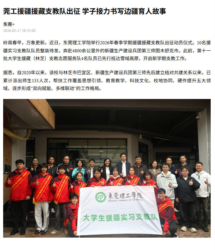 从一个人到一群人,从一个学科到多维赋能,从教育帮扶到校地共生,莞工人播下的种子,正在两地扎根、开花、结果。莞工表示,将继续践行教育援边的责任与担当,深化校地合作长效机制,推动教育援疆援藏工作从“有效”走向“长效”,从“赋能”走向“共生”,在边疆大地上留下更多奋斗足迹,写就更为动人的育人华章。