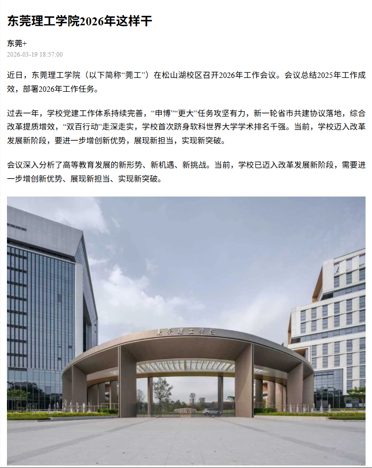 会议提出,2026年工作要以回答好“强国建设,莞工何为”这一时代命题为核心,立足“十四五”时期“四个一流”体系建设的基础,主动应对未来高等教育形态变革与区域人才供需适配作出深刻调整。要把推动人才培养体系的系统性改革作为核心任务与关键突破口,紧盯人才培养模式优化、教育质量与成效提升、人工智能与数字化技术赋能、产教深度融合等方向,围绕人工智能赋能和先进制造业创新两大主题,着力打破学科壁垒,贯通产学研链条,精准把握产业发展需求,进一步推动学校高质量发展。