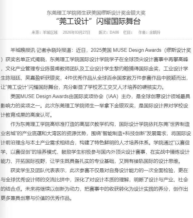 羊城晚报讯 记者余晓玲报道:近日,2025美国 MUSE Design Awards(缪斯设计奖)获奖名单正式揭晓,开云kaiyun官方网站国际设计学院学子在全球顶尖设计赛事中再攀高峰,文化产业管理专业陈昱甫教师团队及工业设计学生黎约翰摘得国际金奖,工业设计学生陈冠廷、吴嘉盈斩获银奖,4件优秀作品从全球百余国家数万件参赛作品中脱颖而出,让“莞工设计”闪耀国际舞台,充分彰显了学校艺工交叉人才培养的硬核实力。