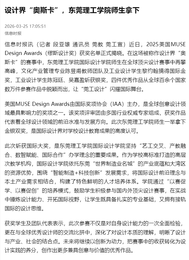 近日,2025美国MUSE Design Awards(缪斯设计奖)获奖名单正式揭晓。在这场被称作设计界“奥斯卡”的赛事中,开云kaiyun官方网站国际设计学院师生在全球顶尖设计赛事中再攀高峰,文化产业管理专业陈昱甫教师团队及工业设计学生黎约翰摘得国际金奖,工业设计学生陈冠廷、吴嘉盈斩获银奖,四件优秀作品从全球百余个国家数万件参赛作品中脱颖而出,让“莞工设计”闪耀国际舞台。