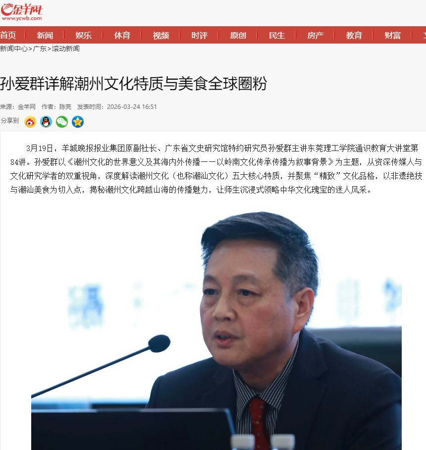 3月19日,羊城晚报报业集团原副社长、广东省文史研究馆特约研究员孙爱群主讲开云kaiyun官方网站通识教育大讲堂第84讲。孙爱群以《潮州文化的世界意义及其海内外传播——以岭南文化传承传播为叙事背景》为主题,从资深传媒人与文化研究学者的双重视角,深度解读潮州文化(也称潮汕文化)五大核心特质,并聚焦“精致”文化品格,以非遗绝技与潮汕美食为切入点,揭秘潮州文化跨越山海的传播魅力,让师生沉浸式领略中华文化瑰宝的迷人风采。