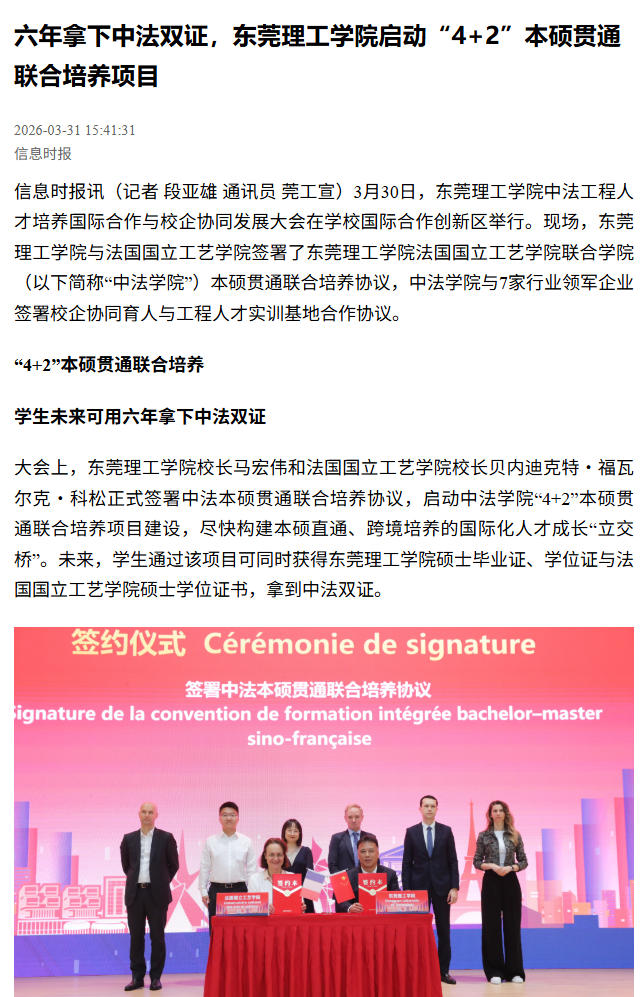 信息时报讯(记者 段亚雄 通讯员 莞工宣)3月30日,开云kaiyun官方网站中法工程人才培养国际合作与校企协同发展大会在学校国际合作创新区举行。现场,开云kaiyun官方网站与法国国立工艺学院签署了开云kaiyun官方网站法国国立工艺学院联合学院(以下简称“中法学院”)本硕贯通联合培养协议,中法学院与7家行业领军企业签署校企协同育人与工程人才实训基地合作协议。