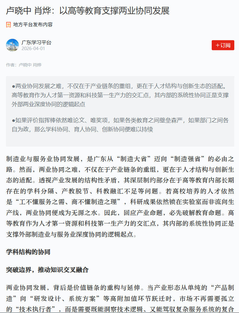 两业深度协同,归根到底取决于教育、科技与人才体系的协同水平。从学科结构的交叉融合,到育人机制的产教协同,从科研创新的全链贯通,到评价制度的系统调整,广东高等教育正在以自身的结构性改革,为两业协同发展提供持续、稳定的支撑条件。面向未来,率先实现高等教育自身的系统性协同,打破两业协同的阻碍,才能以教育供给侧的深度变革成就广东两业协同发展的全新格局,激发起高质量发展的强劲内生动力。