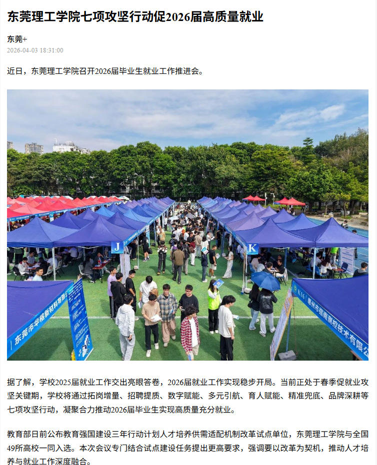 突出数智赋能精准匹配。持续打造“莞工就业集市”品牌,2025年常态化举办分行业、分专业、分区域专场招聘会33场,岗位匹配效率提升36%;建成AI智能面试舱、就业创业学习平台及大数据就业信息管理系统,累计推送分专业精准岗位信息超400万条,近七成毕业生通过校园招聘实现就业。