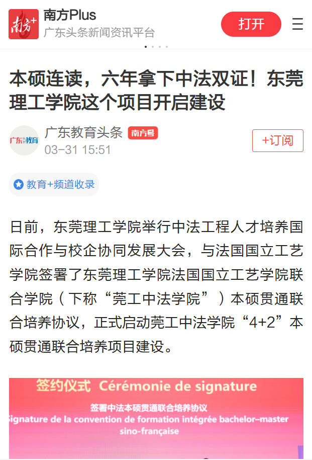 2017年,莞工中法学院正式设立。学院院长尹玲称,此次新一轮合作协议的签署,实现了从单一本科合作向本硕贯通培养体系的拓展,并由“课程引进+教学合作”向体系化联合培养和协同育人机制转变,将更加强调培养过程的整体设计与质量保障。