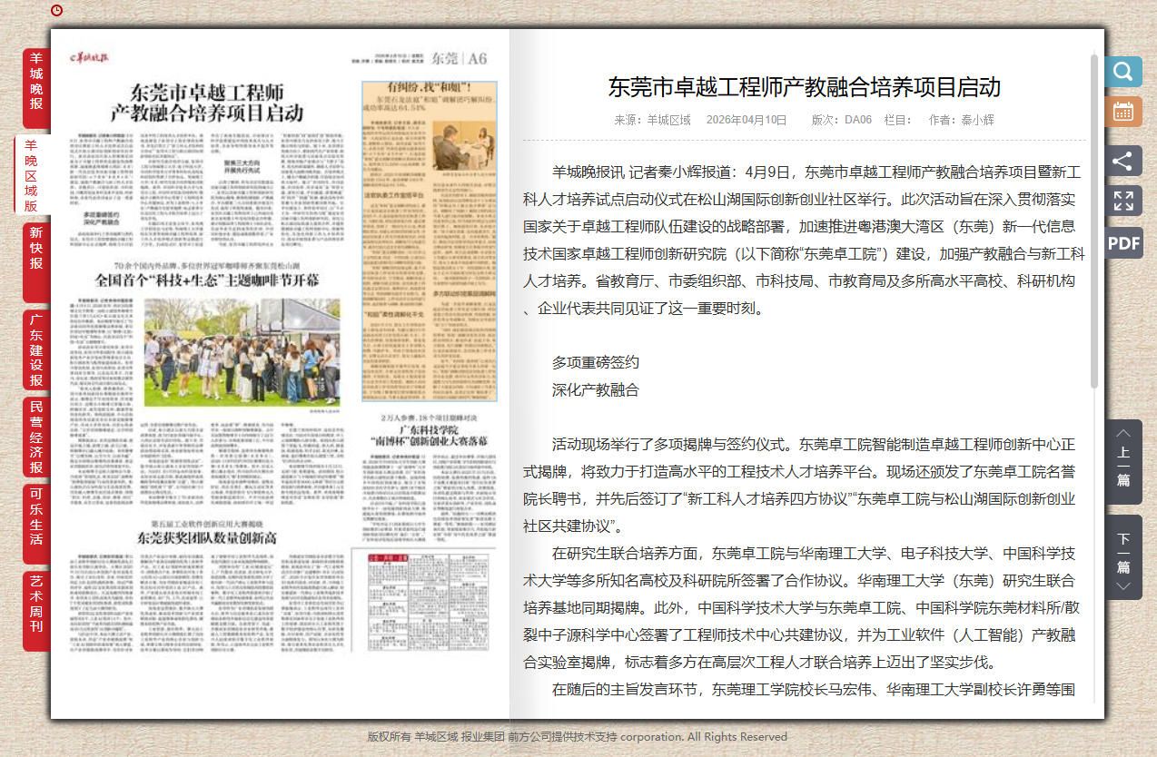 羊城晚报讯 记者秦小辉报道:4月9日,东莞市卓越工程师产教融合培养项目暨新工科人才培养试点启动仪式在松山湖国际创新创业社区举行。此次活动旨在深入贯彻落实国家关于卓越工程师队伍建设的战略部署,加速推进粤港澳大湾区(东莞)新一代信息技术国家卓越工程师创新研究院(以下简称“东莞卓工院”)建设,加强产教融合与新工科人才培养。省教育厅、市委组织部、市科技局、市教育局及多所高水平高校、科研机构、企业代表共同见证了这一重要时刻。