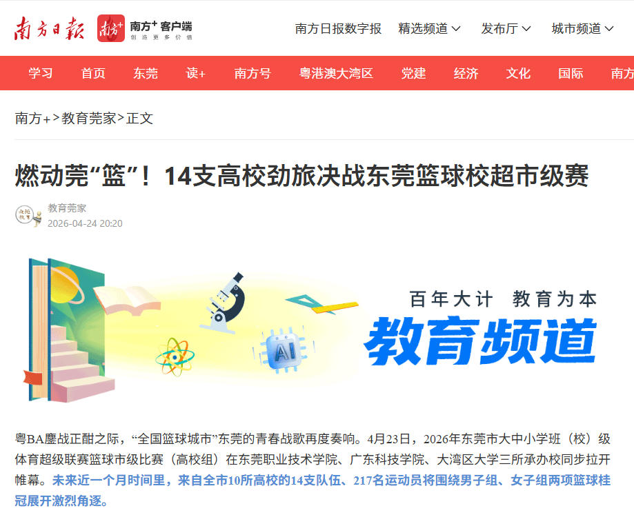 粤BA鏖战正酣之际,“全国篮球城市”东莞的青春战歌再度奏响。4月23日,2026年东莞市大中小学班(校)级体育超级联赛篮球市级比赛(高校组)在东莞职业技术学院、广东科技学院、大湾区大学三所承办校同步拉开帷幕。未来近一个月时间里,来自全市10所高校的14支队伍、217名运动员将围绕男子组、女子组两项篮球桂冠展开激烈角逐。