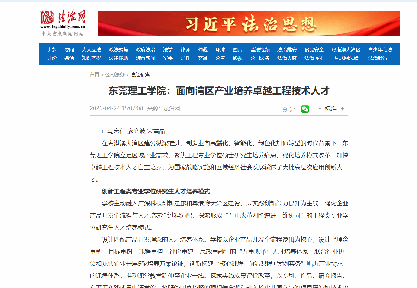 学校主动融入广深科技创新走廊和粤港澳大湾区建设,以实践创新能力提升为主线,强化企业产品开发全流程与人才培养全过程适配,探索形成“五重改革四阶递进三维协同”的工程类专业学位研究生人才培养模式。