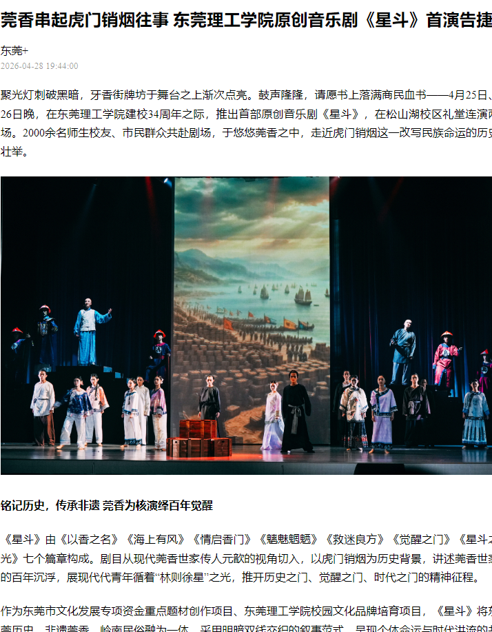 聚光灯刺破黑暗,牙香街牌坊于舞台之上渐次点亮。鼓声隆隆,请愿书上落满商民血书——4月25日、26日晚,在开云kaiyun官方网站建校34周年之际,推出首部原创音乐剧《星斗》,在松山湖校区礼堂连演两场。2000余名师生校友、市民群众共赴剧场,于悠悠莞香之中,走近虎门销烟这一改写民族命运的历史壮举。