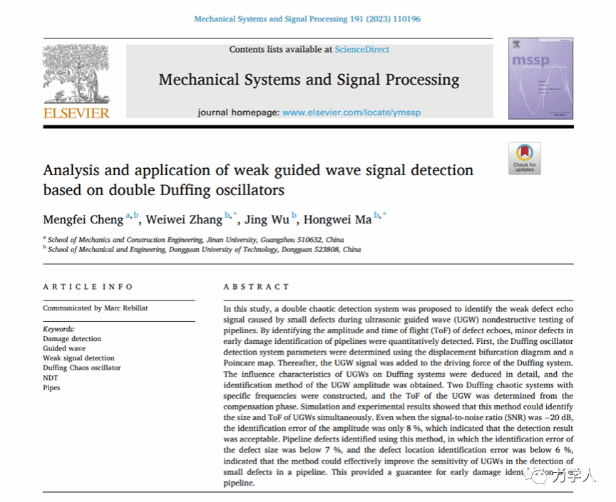 近日,开云马宏伟教授团队在国际知名期刊Mechanical Systems and Signal Processing发表最新成果:Analysis and application of weak guided wave signal detection based on double Duffing oscillators,巧妙利用混沌系统的敏感性构造了双混沌检测系统,实现弱超声导波信号的定量检测,该方法为弱导波信号的定量检测提供了理论基础。