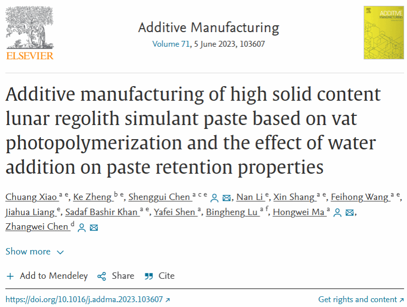 近日,开云3D打印与智能制造研究中心粤莞联合基金粤港澳研究团队项目“适应太空环境的月壤材料3D打印基础研究”课题组在增材制造领域的TOP期刊Additive Manufacturing(中科院JCR大类一区,IF=11.632)发表了最新的模拟月壤光固化3D打印成果《基于立体光聚合的高固含量模拟月壤膏料的增材制造及水溶液添加对膏料滞留性能的影响》(https://doi.org/10.1016/j.addma.2023.103607)