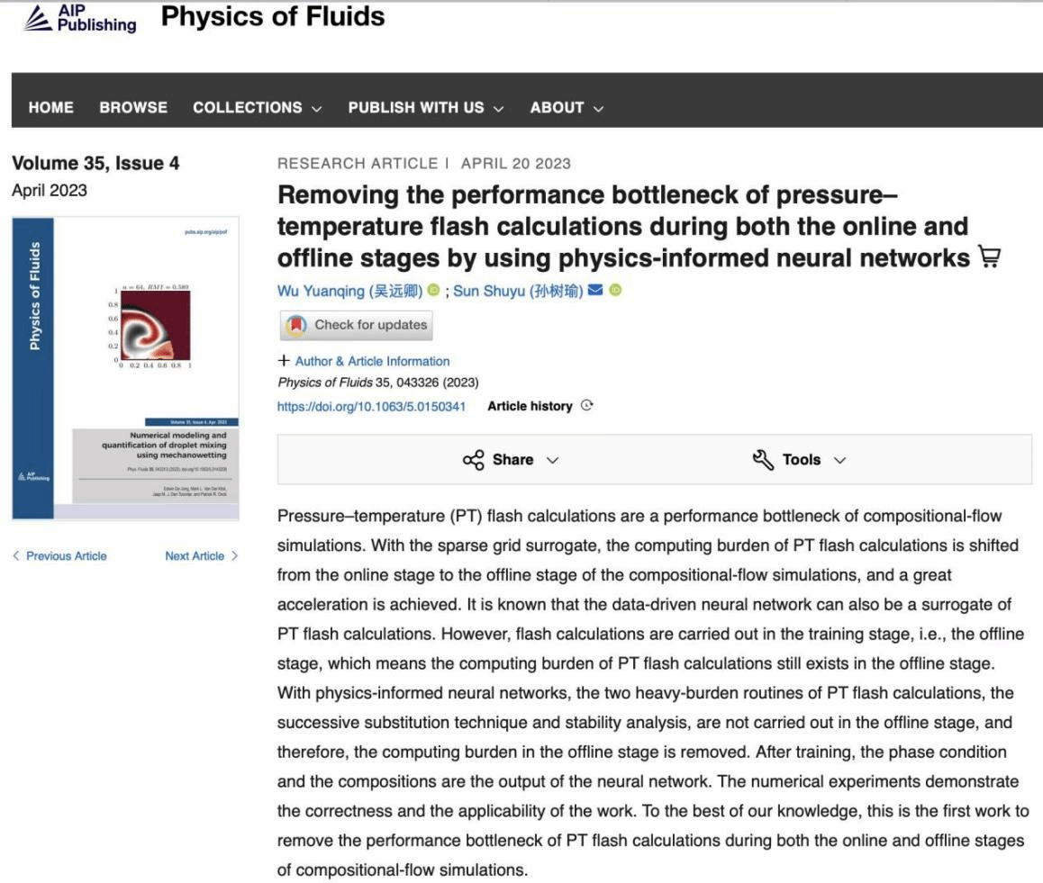 近日,吴远卿特聘副教授在流体力学领域权威期刊Physics of Fluids 上发表题目为Removing the performance bottleneck of pressure–temperature flash calculations during both the online and offline stages by using physics-informed neural networks的研究论文(DOI: https://doi.org/10.1063/5.0150341)。开云kaiyun官方网站为本文第一完成单位,阿卜杜拉国王科技大学的孙树瑜教授为本文通讯作者。
