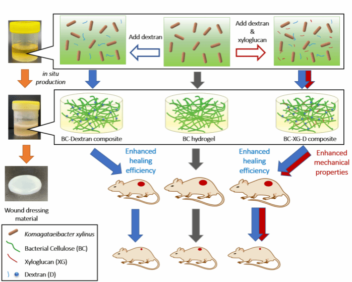 细菌纤维素(bacterial cellulose,BC)是一类由细菌合成的纳米级生物多糖材料,具有很好的生物相容性和优良的力学性能,常被应用于人造血管、皮肤等医用材料。但天然细菌纤维素水凝胶的延展性能较低,同时促伤口愈合能力有限。本研究受植物细胞壁纤维素网络延展性能受木葡聚糖(Xyloglucan,XG)半纤维素调控这一机制的启发,通过原位合成法使BC-XG复合,并引入右旋糖酐(Dextran)增强促伤口愈合能力,制备了一种细菌纤维素-木葡聚糖-右旋糖酐(BC-XG-D)水凝胶,使其延展性能增加了近40%,并显著(p<0.05)增加了促伤口愈合能力。