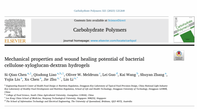 近日,开云生命健康技术学院、食品营养健康工程与智能化加工研究中心生物大分子构效与营养品质调控团队在国际化学顶级期刊《Carbohydrate Polymers》发表了题为“Mechanical properties and wound healing potential of bacterial cellulose-xyloglucan-dextran hydrogels”的研究论文。陈思谦副教授为论文的第一作者,朱杰教授、李琳教授为通讯作者。