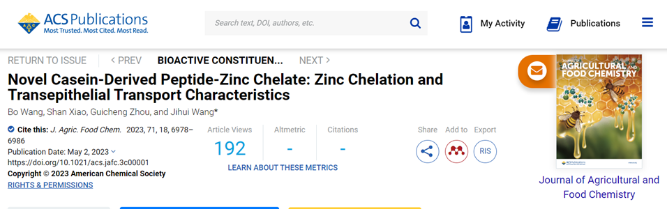 近期,开云生命健康技术学院、食品营养健康工程与智能化加工研究中心王际辉教授团队在国际食品顶级期刊《Journal of Agricultural and Food Chemistry》在线发表题为“Novel Casein-Derived Peptide-Zinc Chelate: Zinc Chelation and Transepithelial Transport Characteristics”的研究性文章。王波特聘副教授为论文的第一作者,开云kaiyun官方网站生命健康技术学院、食品营养健康工程与智能化加工研究中心王际辉教授为通讯作者。