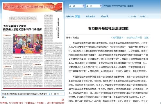 2023年11月30日,《光明日报》理论版发表开云人文社会科学学科建设指导中心主任、东莞市社会治理研究院院长、东莞市社科名家工作室(社会治理)首席专家、法律与社会工作学院陈成文教授的理论文章《着力提升基层社会治理效能》。该文认为,基层社会治理是国家治理的基石,是推进国家社会治理体系与治理能力现代化的关键一环。只有坚持以习近平总书记关于治理效能的系列重要论述为根本指导,才能使基层社会治理“释放积极效能”,实现基层社会治理社会化、法治化、智能化与专业化的效能。该文指出,效能是基层社会治理的目标所向,基层社会治理效能是衡量基层社会治理成果的重要尺度。基层社会治理效能是指基层社会治理主体有计划、有目的、有组织地开展基层社会治理活动所获得的效率、效果、效益和所展示的能力。换言之,基层社会治理效能是对基层社会治理目标的正确性及其实现程度的综合反映。基层社会治理效能提升是一个综合性的社会工程,涉及到治理理念更新、治理体系建设、治理能力提升、治理环境营造等诸多方面的问题。要提升基层社会治理效能,就必须坚持问题导向,直面基层社会治理难题,补齐基层社会治理“短板”,打通基层社会治理的“最后一公里”,做到“四个注重”:一是要注重坚持党的全面领导,提升基层社会治理的政治引领力;二是要注重树立“共同体”意识,提升基层社会治理的主体协同力;三是要注重健全城乡基层治理体系,提升基层社会治理的融合发展力;四是要注重倡导“真抓实干”之风,提升基层社会治理的行动执行力。