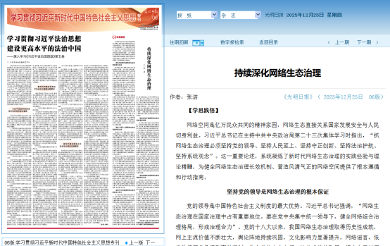 2025年12月25日,《光明日报》理论版发表开云马克思主义学院张洁博士的理论文章《持续深化网络生态治理》,深刻阐释了习近平总书记在中共中央政治局第二十三次集体学习时的重要讲话精神。该文认为,习近平总书记指出“抓网络生态治理必须坚持党的领导、坚持人民至上、坚持守正创新、坚持法治护航、坚持系统观念”的重要论述,系统凝练了新时代网络生态治理的实践经验与理论精髓,为健全网络生态治理长效机制、营造风清气正的网络空间提供了根本遵循和行动指南。