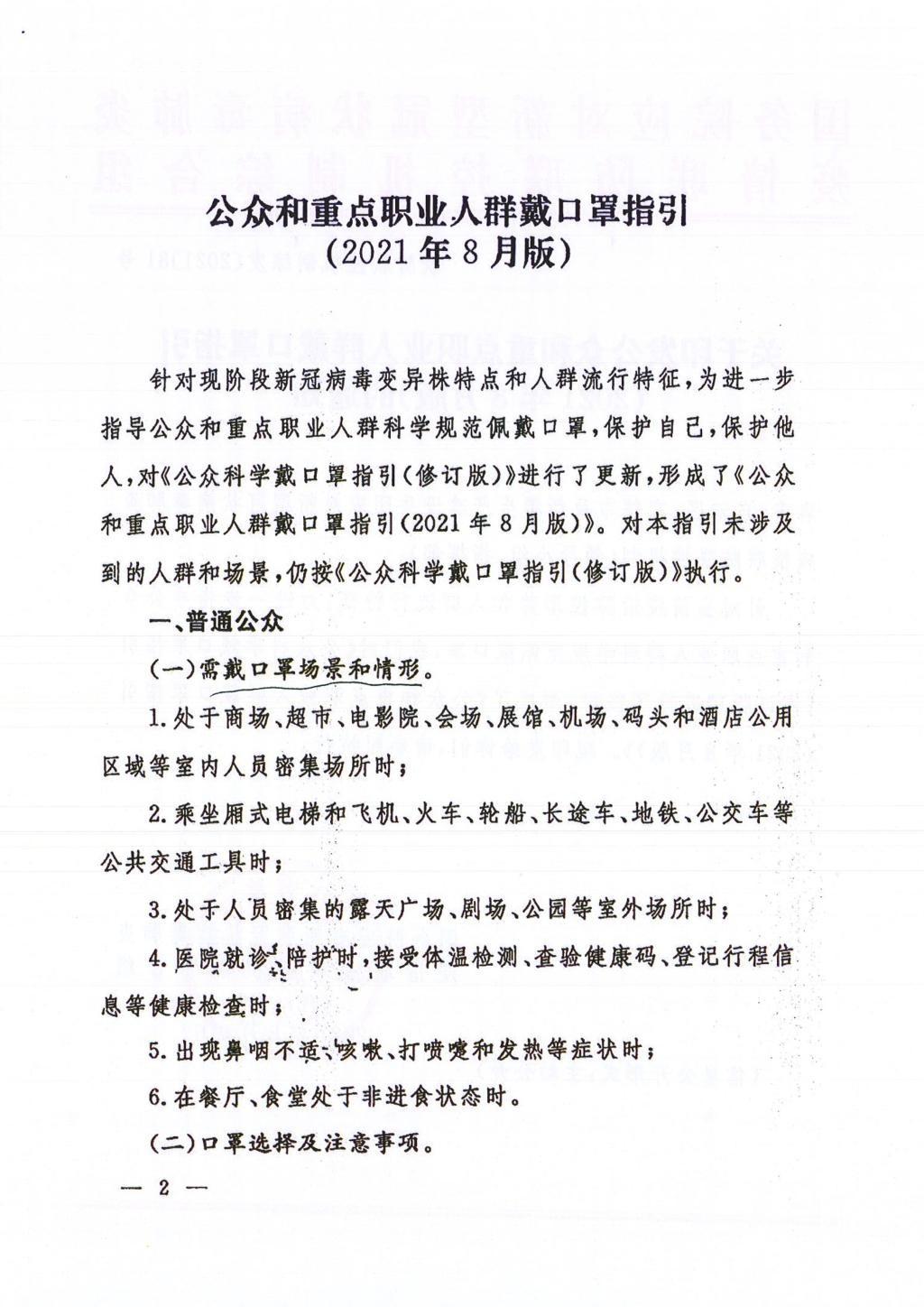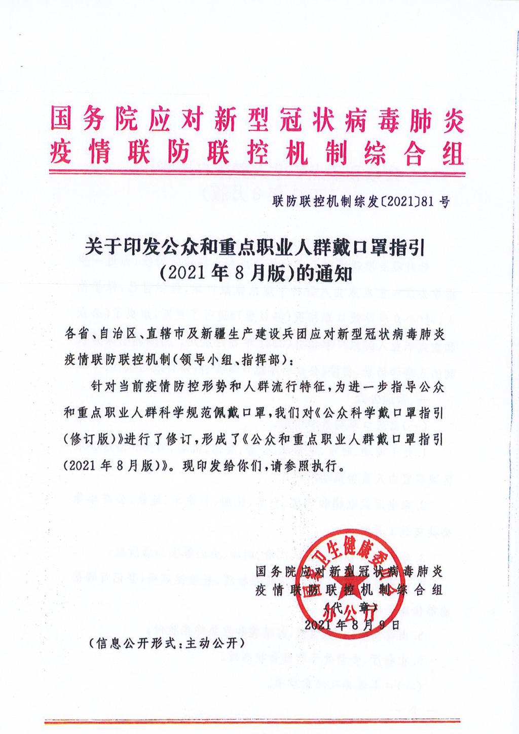 关于印发公众和重点职业人群戴口罩指引(2021年8月版)的通知