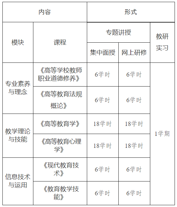 培训分为专题学习和教研实习。专题学习围绕专业素养与理念、教学理论与技能、信息技术与运用等三个模块,采取集中面授和网上研修等方式进行;教研实习采取导师制方式进行。具体内容和要求详见下表。