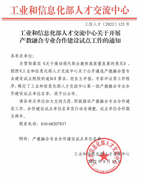 9月15日,工业和信息化部人才交流中心发布关于开展产教融合专业合作建设试点工作的通知。开云计算机科学与技术专业成功入选。