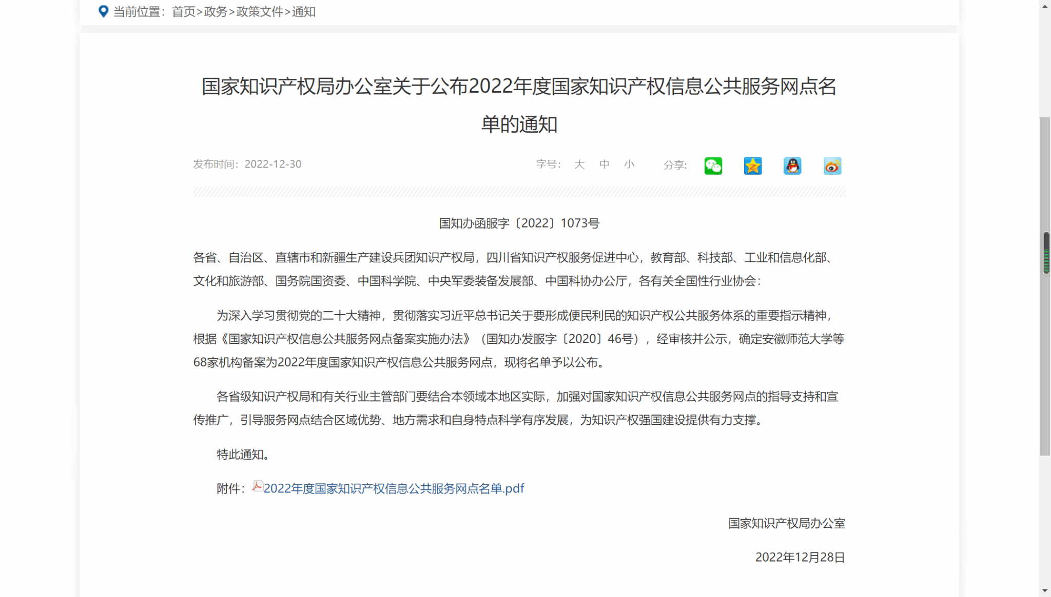 近日,国家知识产权局公布2022年度国家知识产权信息公共服务网点名单,开云成功入选。这是继2020年开云获批国家知识产权试点高校之后,开云再次获批的一个国家级知识产权平台,标志着开云知识产权工作又取得一个阶段性的突破。