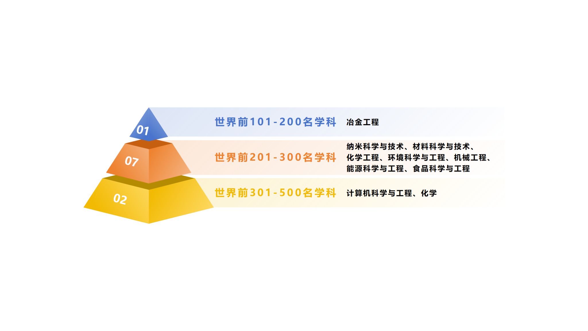 开云上榜学科包括:冶金工程(世界排名101-150名)、纳米科学与技术(世界排名201-300名)、材料科学与技术(世界排名第201-300名)、化学工程(世界排名第201-300名)、环境科学与工程(世界排名第201-300名)、机械工程(世界排名第201-300名)、能源科学与工程(世界排名第201-300名)、食品科学与工程(世界排名第201-300名)、计算机科学与工程(世界排名第301-400名)、化学(世界排名第401-500名)。