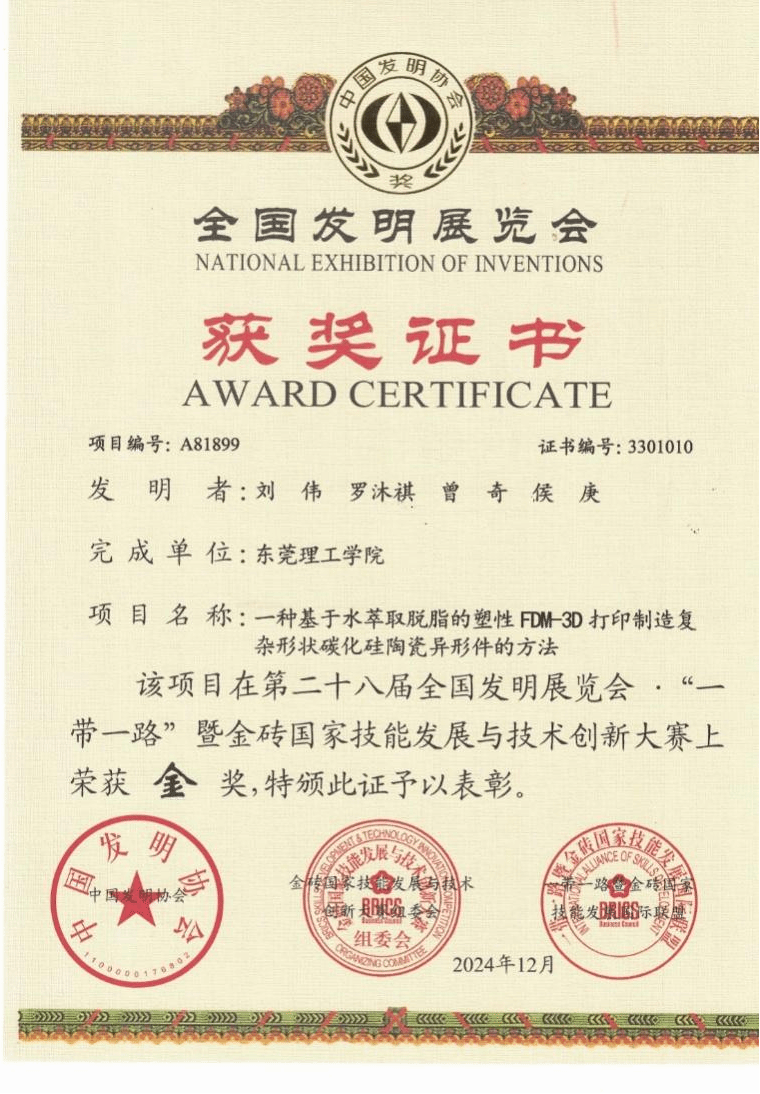 近日,第二十八届全国发明展览会·“一带一路”暨金砖国家技能发展与技术创新大赛在中山市举行。机械工程学院刘伟教授课题组研发的项目“一种基于水萃取脱脂的塑性FDM-3D制造复杂形状碳化硅陶瓷异形件的方法”获得大赛金奖。