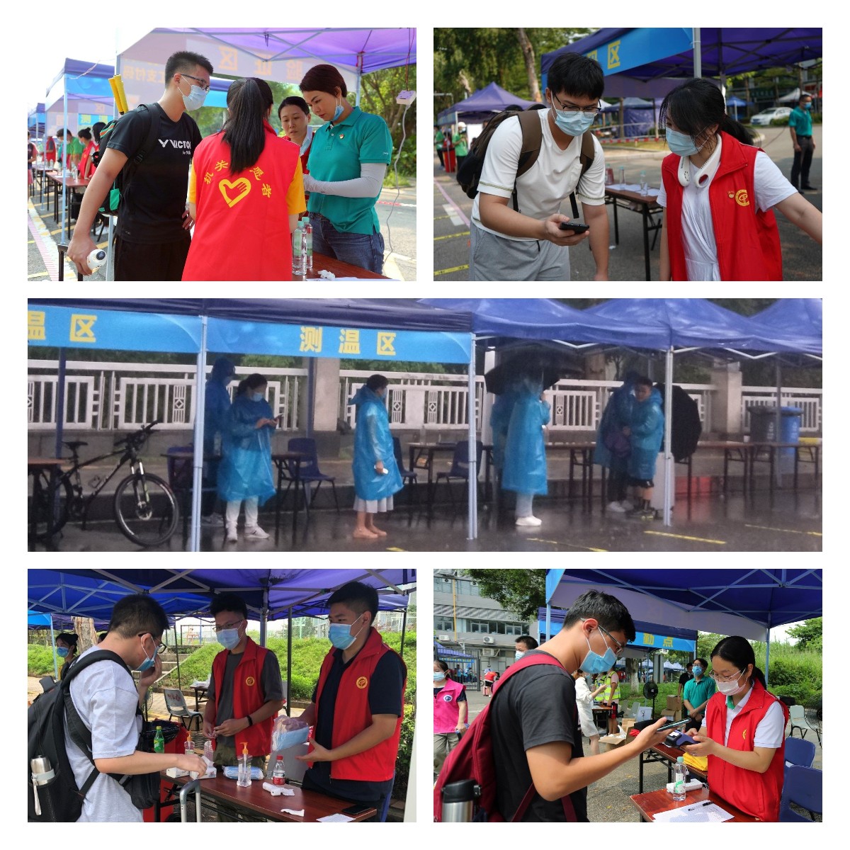 因热汗而湿透也罢,因大雨而湿透也罢,“红马甲”们坚守岗位的意志不变,迎接同学的热情不减,工作环节一个不漏,没有一人退缩、没有一人抱怨,他们坚守的是一种立德树人、服务育人、无私奉献的情怀。