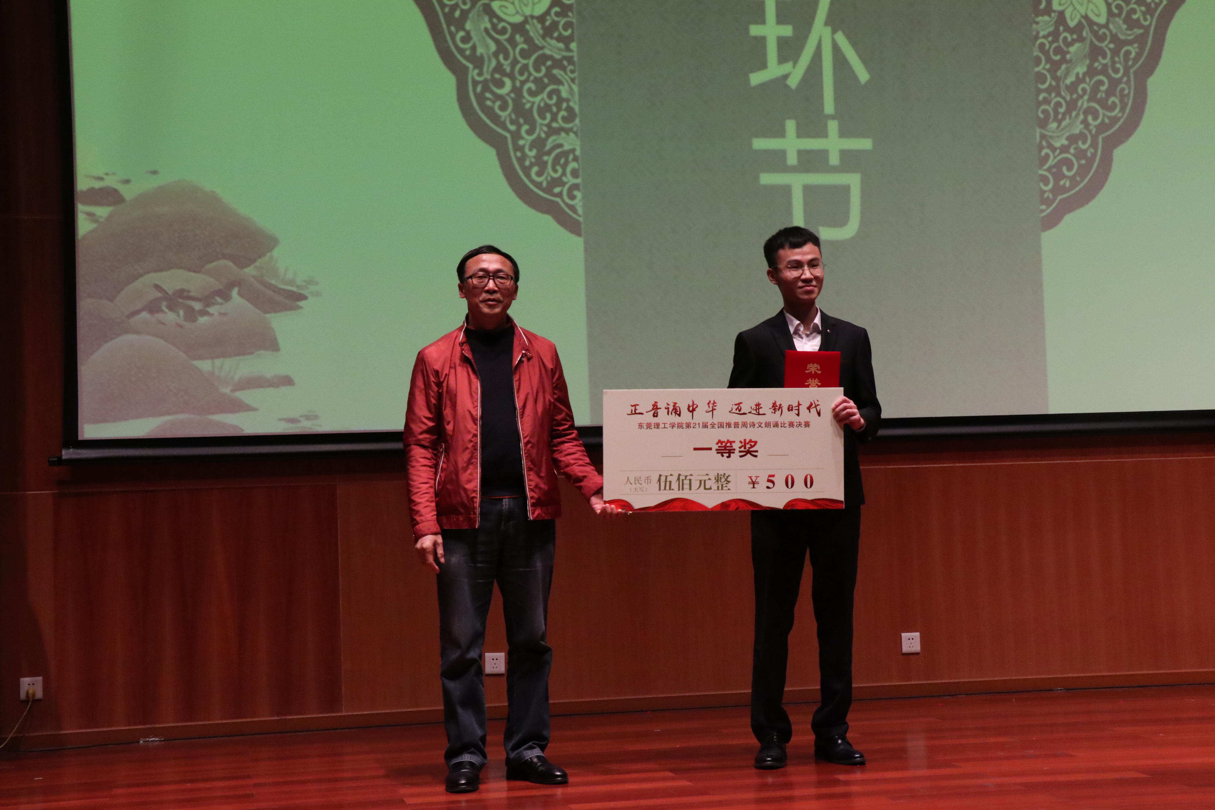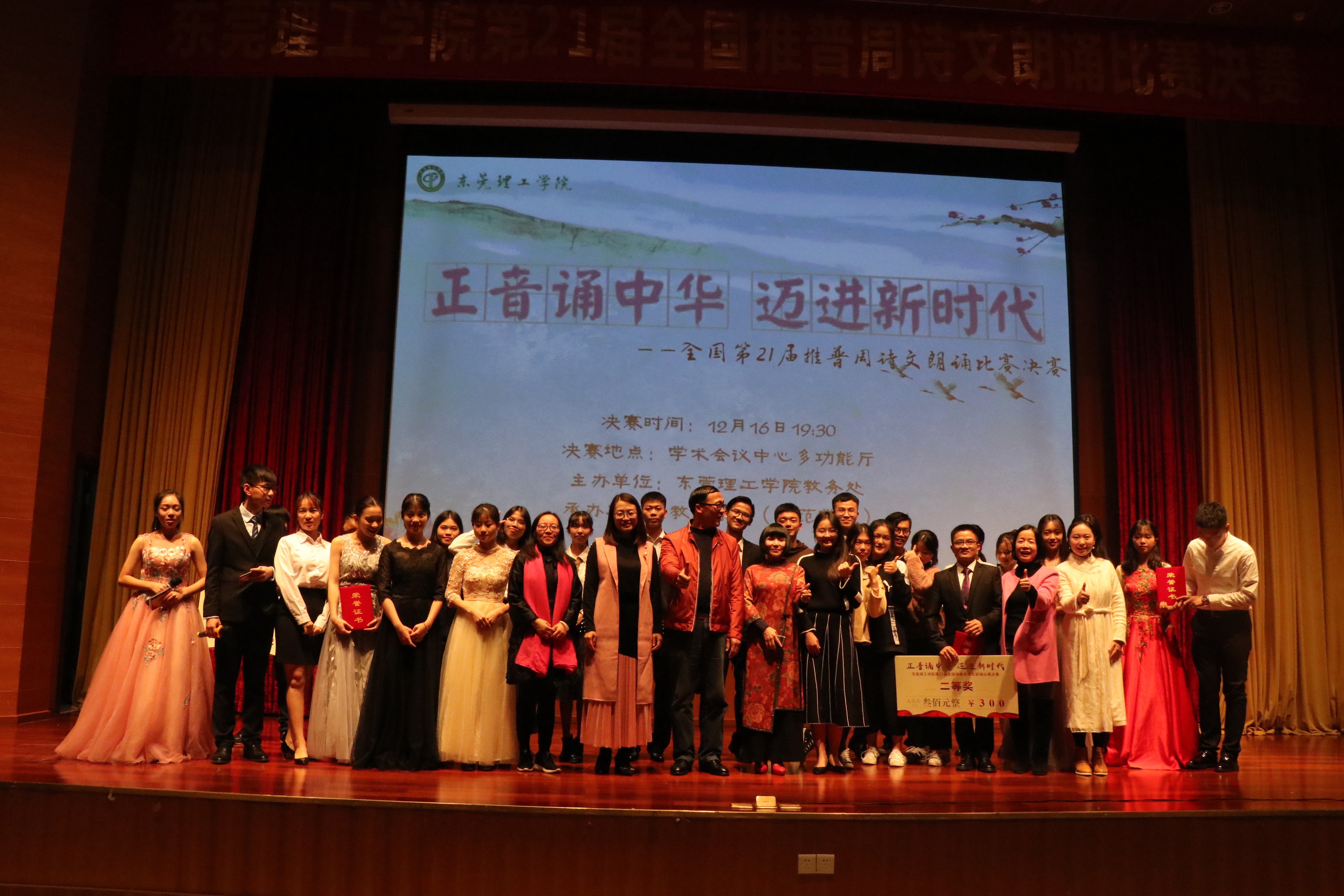 决赛当晚,10组参赛队伍在主持人介绍下纷纷亮相。选手们各展特色,以“正音诵中华,迈进新时代”为主题,为传承和弘扬中华优秀传统文化而深情朗诵。各组选手声情并茂、各显神通:有朗诵激情澎湃,气宇轩昂的《黄河》;有赞颂祖国,期盼统一的《我的南方和北方》;有激情热血,无悔中华的《我骄傲,我是中国人》;有坚持不懈,英勇奋斗的《老人与海》。朗诵、舞蹈、音乐在此次活动中互相交融,展现了我国深厚的文化底蕴。选手们的朗诵十分精彩,赢得了观众一次又一次的掌声。此次比赛分别设立了一、二、三等奖和优秀奖。最终,廖新韵同学摘下桂冠,陈颖琪、陈嘉新等同学荣获二等奖,张玲、梁舒晴等同学荣获三等奖,肖建元、卢宇航等同学荣获优秀奖。比赛之外,评委和嘉宾们也一展风采,往届优秀选手李楠朗诵了《卑微》,文传学院李缨副教授充满感染力地朗诵了《致橡树》,教育学院杨万江副教授也以充沛的情感为大家朗诵了一首《海燕》。