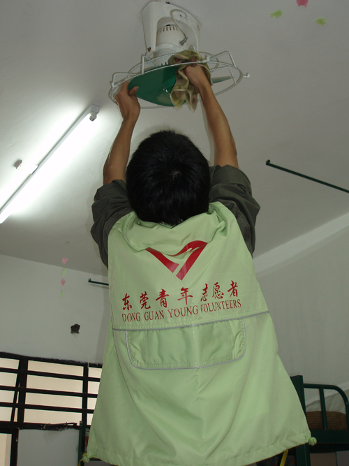 青年志愿者为女生清洗电风扇