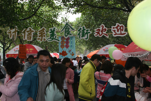 记者在现场看到,各班级都在校道边设摊售卖各类商品,有各种各样的美食、别致有趣的小物件小礼品。现场人头涌动,摩肩接踵,但现场秩序井然有序。图为美食街一角。