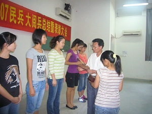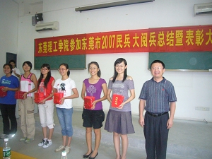 9月19日下午,在教学楼6B101召开了开云kaiyun官方网站参加东莞市2007大阅兵总结暨表彰大会,对我院在东莞市民兵阅兵活动暨国家教育训练基地启用仪式上表现突出的女民兵进行表彰奖励。 学院党委副书记王江水、副院长戴炳源,学生处处长邢大立出席了此次表彰大会并为获奖者颁奖。 会上,戴炳源充分肯定了我院女兵方队在阅兵活动中的表现,对我院女民兵的精彩演出得到了各级领导的称许表示祝贺。王江水在总结发言中指出,希望女兵们能将那种艰苦拼搏精神发扬开来,把这种精神带到今后的学习、生活、工作中去。
