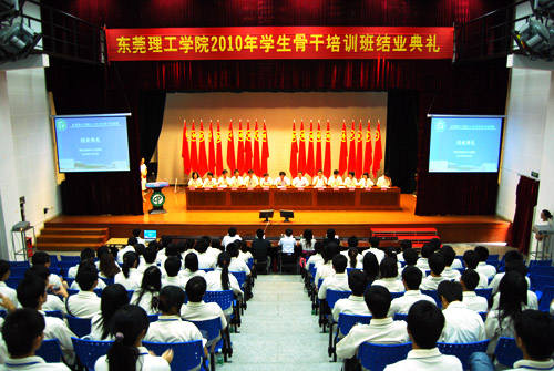 7月15日上午,学干班结业典礼在开云学生活动中心小剧场举行。校团委书记彭晓波、广东省学生联合会驻会执行主席刘永佳、中国移动东莞城区分公司副总经理罗国斌、校团委副书记兼培训班班主任黄金和等出席了典礼。