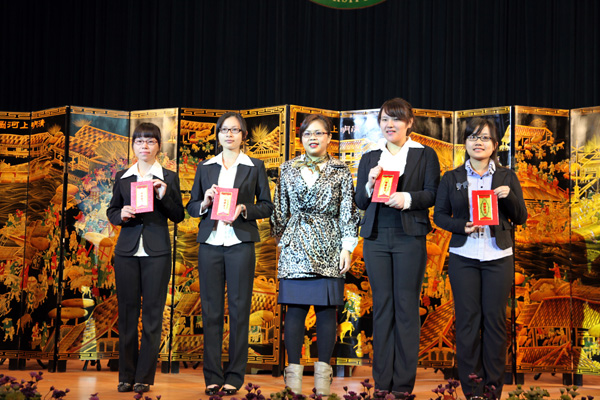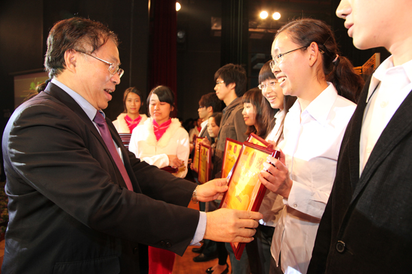 黄碧莲副书记向获得“优秀大学生标兵”称号和国家奖学金的同学颁奖。
