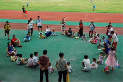 在节日的喜庆气氛中,三位化能学院小主持人登场,为大家介绍活动,带领着小朋友参加竞技项目,如小球进筐,抱球接力,还为四岁以下小朋友参加的“爬爬跑”活动加油鼓劲。紧接竞技项目后是游戏环节,三十来位小朋友们按照标记的红线围坐一圈,井然有序地玩着游戏。每个小朋友还领到了甜滋滋的糖果和七色彩笔等纪念品。