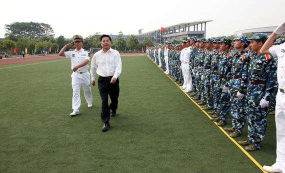 周致纳书记在军训团团长许士刚陪同下检阅受训新生。张友炳/摄