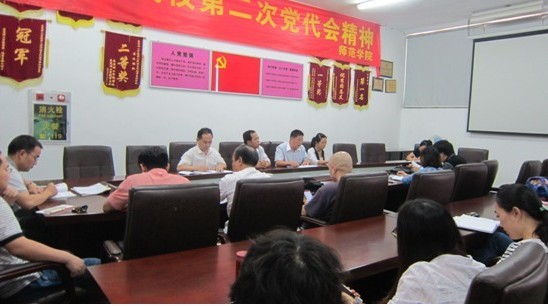 师范学院党总支书记于捷传达了学校第二次党代会的主要精神,他指出全体教职工要以学习和贯彻学校第二次党代会精神为契机,多关注学校的发展,积极为学校的改革和发展献计献策。