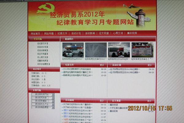 为了抓好2012年纪律教育学习月的活动,真正将学习月活动落到实处,经贸系党总支开通了“经贸系2012年纪律教育学习月活动专题网页”,设置了“纪委文件”、“活动计划”、“活动新闻”、“征文视窗”、“心得交流”、“廉政视频”等栏目,及时报道纪律教育学习月的活动情况。