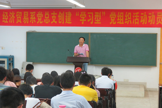 5月30日,经济贸易系党总支召开创建“学习型”党组织活动动员会。经贸系党总支相关负责人及全体学生党员参加了动员会。 会上,经贸系党总支副书记杨万江阐述了创建“学习型”党组织的重要性,介绍了开展创建“学习型”党组织活动的活动方案及安排。经贸系党总支将用一年的时间开展系列的创建活动,将计划举办党员理论学习培训班、建立党员学习教育制度、开展专业导师系列讲座和证券交易技能培训系列讲座、举办入党积极分子暨预备党员培训班、建立党员监督岗、开展党员与群众“结对帮扶”活动、实行学生党员量化考核制度和学风建设承诺书制度、召开学习经验交流会、举行建设学习型党组织手抄报比赛和演讲比赛、举办党的知识竞赛及开展系列志愿活动等。 据介绍,经贸系党总支将通过创建“学习型”党组织活动,进一步提高全系党员对建设"学习型”党组织活动重要性的认识,使全系党员进一步树立学习理念,增强学习的自觉性。大家纷纷表示一定会积极参加创建“学习型”党组织的活动,不断提高自身的党性修养,更好地发挥党员的模范带头作用。