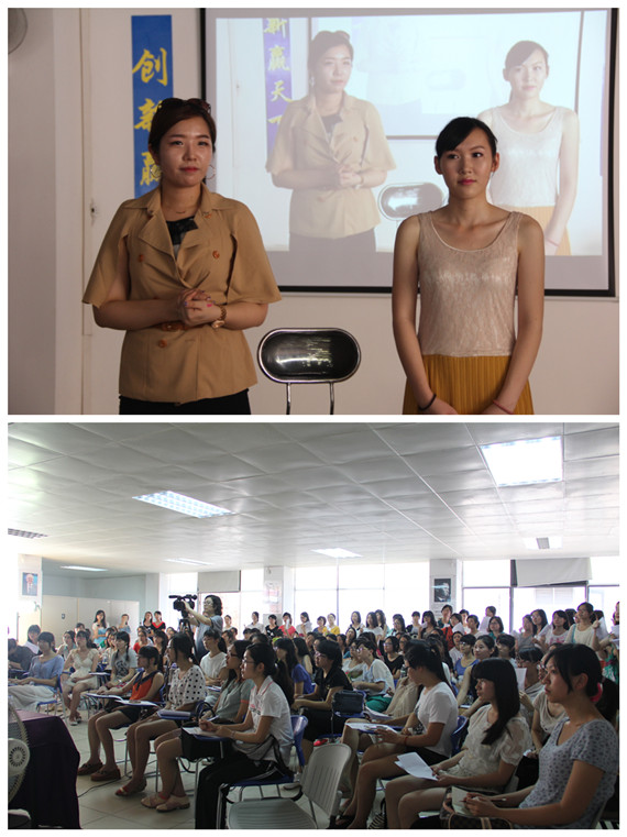 讲座上,权润贞结合自身的职场经验,从职场新人的角度出发,阐释了在职场中应该如何保持优雅、得体的言行举止,以及搭配着装和选择妆容等内容。讲座穿插了现场形象设计技巧演示、提问等互动环节,气氛十分活跃。