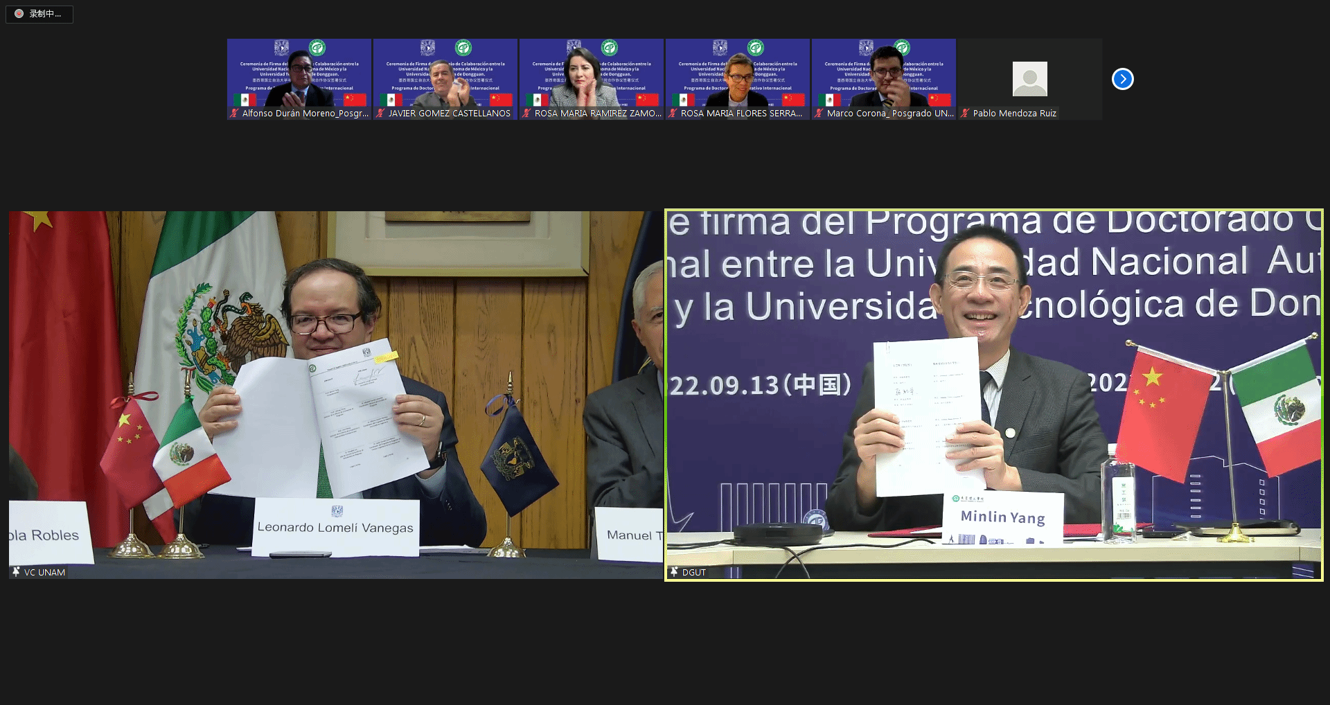 2022年9月13日上午,开云与墨西哥国立自治大学举行国际联合培养博士项目协议线上签署仪式。开云副校长杨敏林与墨西哥国立自治大学秘书长莱昂纳多·洛梅利分别代表两校签约。开云研究生处处长程发良、国际合作与交流处处长王际辉及相关工作人员,墨西哥国立自治大学研究生院院长曼努埃尔·托雷斯、外事处处长弗朗西斯科·特里戈及相关项目负责人等共同见证了签约仪式。