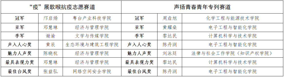 在决赛中,同学们的歌声热情昂扬,表演精神饱满,吸引了众多观众送花喝彩。经过激烈的角逐,最终粤台产业科技学院的邝启炀同学荣获“疫”展歌喉抗疫志愿赛道的冠军,化学工程与能源技术学院的周垚旭同学荣获声扬青春青年专列赛道的冠军。此次线上歌唱比赛充分传递了莞工青年爱国爱家的情怀和积极向上的正能量。唱出青春,更唱出心中力量。