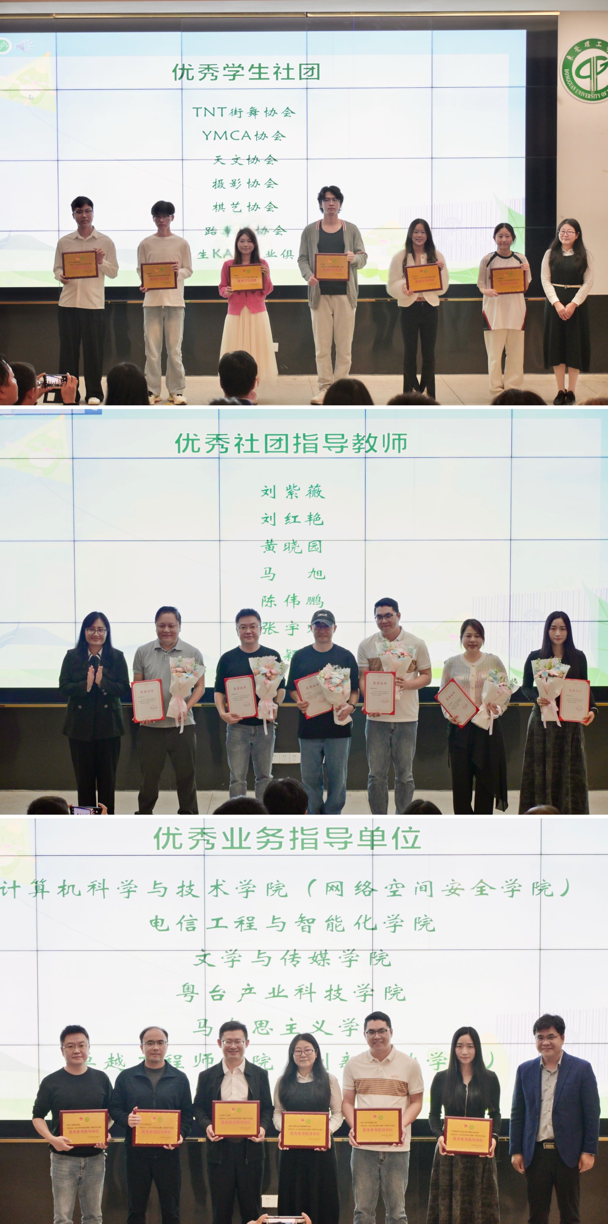 会上对2024-2025学年度优秀学生社团进行表彰。经材料审核、述职答辩、满意度调查等环节综合评议,棋艺协会等7个社团被评定为优秀学生社团,陈伟鹏等7名教师被评为优秀指导教师,粤台产业科技学院等7个组织机构被评为优秀业务指导单位。