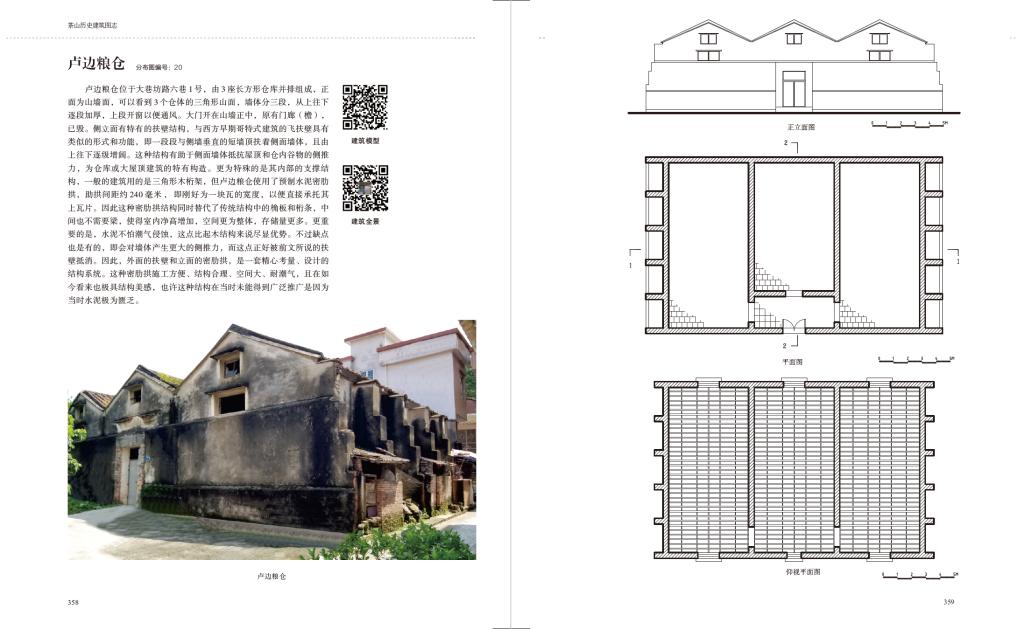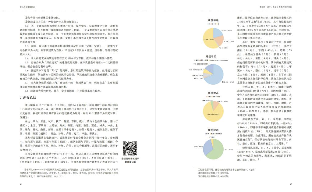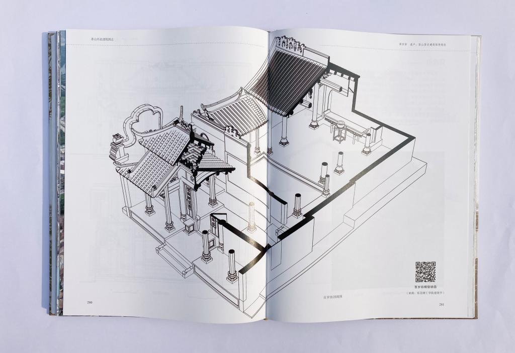 为编著本书,袁艺峰老师带着学生进行了扎实的田野调研,毯式普查了全镇所有传统聚落,某些普查区域延伸到1990年代的新村范围,总普总面积共计约276万平方米,共录入具有不同程度建筑遗产价值的建筑1597处,由此基本确认了全镇的建筑遗产留存情况。其后编著团队实地测绘绘制了50余座建筑的图纸,并附遗产分布图、统计表,以便读者从另一更科学客观的角度了解茶山的历史建筑,作为基础研究资料,也有助于后续的进一步研究。除了测绘图纸,该书还附带了许多建筑、村落的360°全景图、数字模型二维码,读者可以通过手机扫码,以更为交互、具象、身临其境的方式观察屏幕内展示的另一番茶山历史建筑景象。这种传播媒介的创新也是本研究跨领域的尝试。