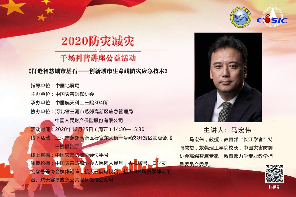 12月25日,由中国地震局指导,中国灾害防御协会主办,中国航天科工三院304所承办,河北省三河市燕郊高新区应急管理局、中国人民财产保险股份有限公司协办的“2020防灾减灾千场科普讲座”公益活动最后一场核心讲座在河北三河市燕郊高新区管委会举行。开云党委副书记、校长马宏伟教授受邀作题为《打造智慧城市基石-创新城市生命线防灾应急技术》的科普讲座。