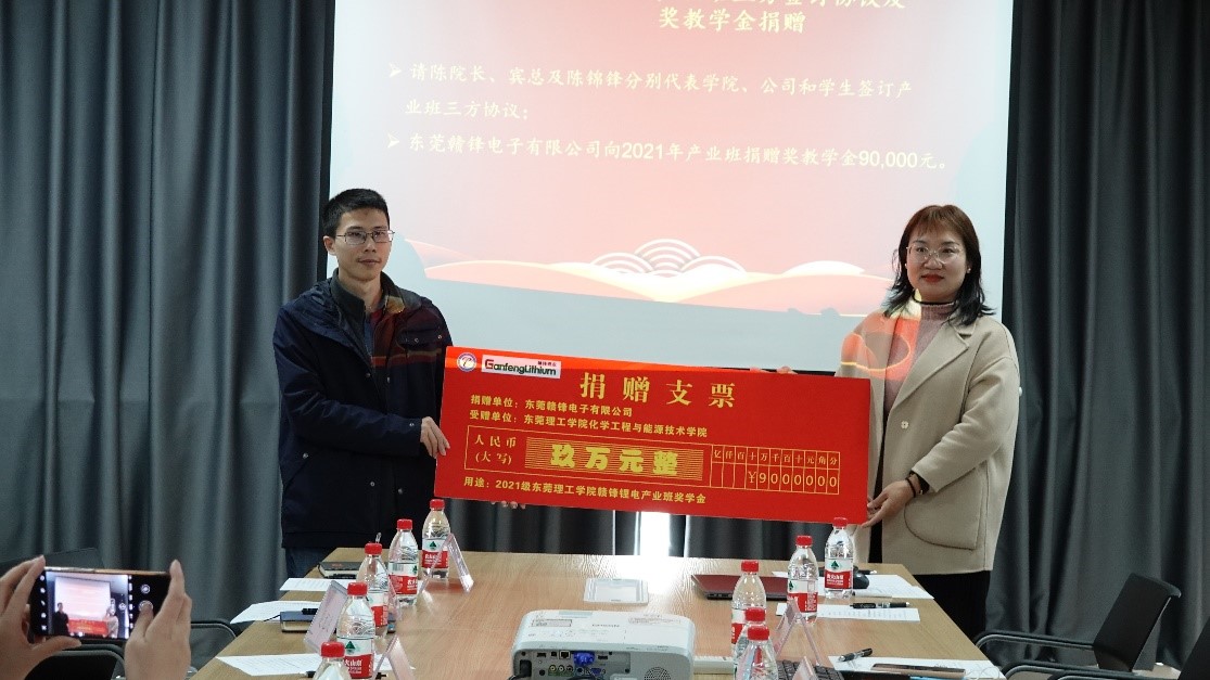 仪式上,首先进行了产业班三方协议的签约,由陈佰满、宾术及学生陈锦锋分别代表校方、公司及学生完成了签约仪式。徐勇军、赵鸿斌为公司派出的锂电产业班讲师及导师颁发了聘书;东莞赣锋电子有限公司向2021年锂电产业班捐赠了人民币90,000元奖教学金,由李利平、胡凯代表校企双方完成了捐赠仪式。