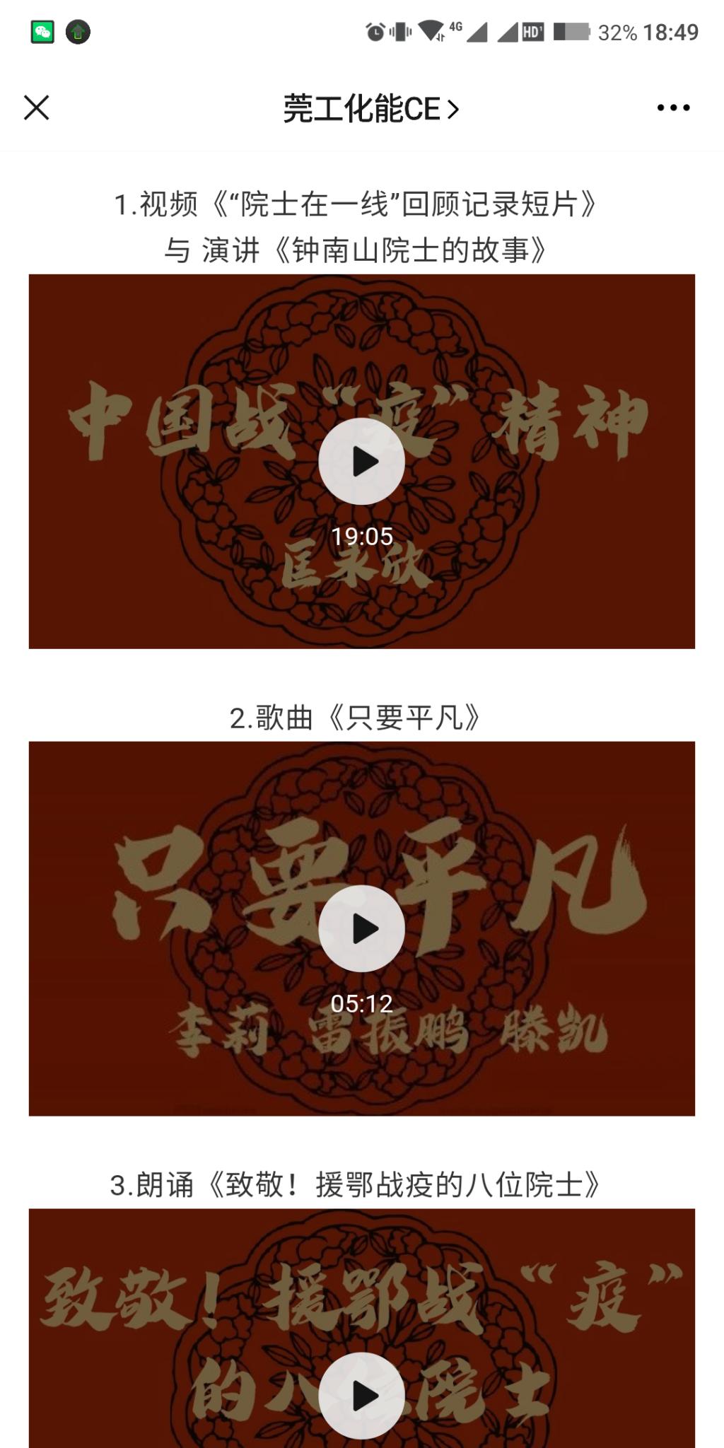 活动在视频《“院士在一线”回顾记录短片》的播放中开幕,匡永欣等三位同学讲述了《钟南山院士的故事》,再现了钟南山院士对百姓生命健康高度负责、心怀家国大义的时代英雄形象。李莉、滕凯、雷振鹏三位同学合唱了歌曲《只要平凡》,用深情的歌喉,弘扬了平凡人不平凡的战“疫”精神。许漫媛、李洁、周李拓鹏、程克勉四位同学朗诵了《致敬!援鄂战疫的八位院士》,讴歌了钟南山、李兰娟、王辰、黄璐琦、张伯礼、陈薇、乔杰、仝小林等八位院士带领团队齐聚湖北疫情重灾区,在这场艰巨的战役中,义无反顾、挺身而出。他们心忧民瘼而展现的科学精神,标注了专业深度;不辞辛苦、忘我投入,则抵达了精神高度。而贯穿其中的人格魅力,又折射出科学家应具有的家国情怀。他们是院士也是战士,更有国士的责任担当。