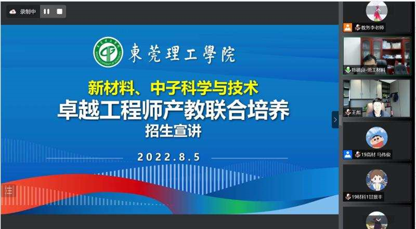为构建产教全方位全过程深度融合的协同育人长效机制,不断提升高校服务地方科技发展的能力和应用型人才培养的质量, 8月5日下午,材料科学与工程学院举行新材料、中子科学与技术卓越工程师产教联合培养线上研讨会,会议以线上腾讯会议的方式举行。会议邀请了中国科学院高能物理研究所东莞研究部副主任孙志嘉,生益科技公司部长王猛,宜安科技公司副经理刘芳菲,集泰股份公司技术招聘主管蔡晨进行宣讲。材料科学与工程学院科研副院长李润霞,党委副书记陈礼明,各系主任、学科带头人和学院2019级全体学生出席了会议。本次宣讲会议由材料科学与工程学院教学副院长陈德良主持。