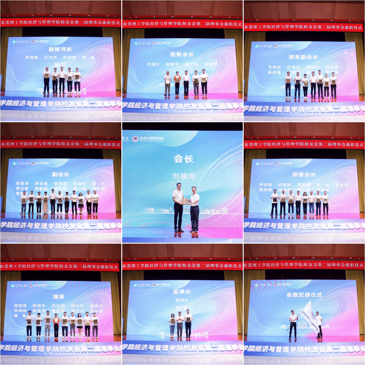 校友会新一届理事会成员分批上台接受聘任。新老会长进行了会旗交接仪式,宣告第二届经管学院校友会理事会圆满成立。